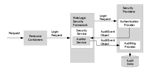 The auditing process is initiated when a resource container passes a user's authentication information (for example, a username/password combination) to the WebLogic Security Framework as part of a login request. The WebLogic Security Framework passes the information associated with the login request to the configured Authentication provider. If, in addition to providing authentication services, the Authentication provider is designed to post audit events, the Authentication provider instantiates an AuditEvent object. The AuditEvent object includes information such as the event type to be audited and an audit severity level. The Authentication provider then calls the Auditor Service in the WebLogic Security Framework, passing in the AuditEvent object. The Auditor Service passes the AuditEvent object to the configured Auditing providers' runtime classes, enabling audit event recording. The Auditing providers' runtime classes use the information obtained from the AuditEvent object to control audit record content. When the criteria for auditing specified by the Authentication providers in the AuditEvent object is met, the appropriate Auditing provider's runtime class writes out audit records. Depending on the Auditing provider implementation, audit records may be written to a file, a database, or some other persistent storage medium.