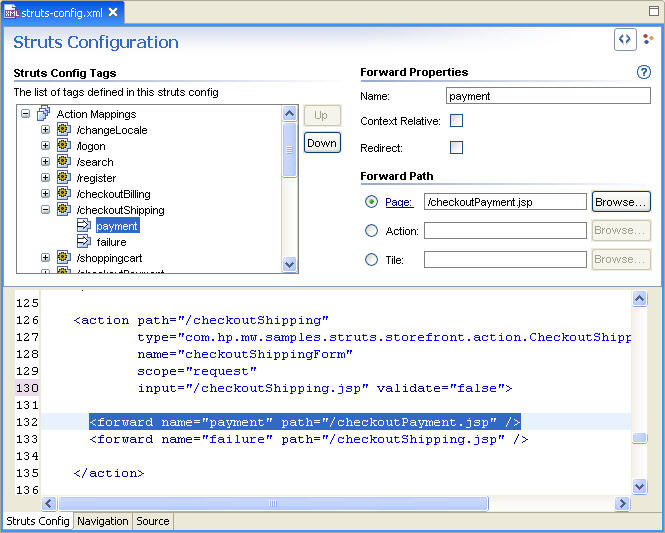 In the Struts Config view, expand the Action Mappings node and select the payment forward
