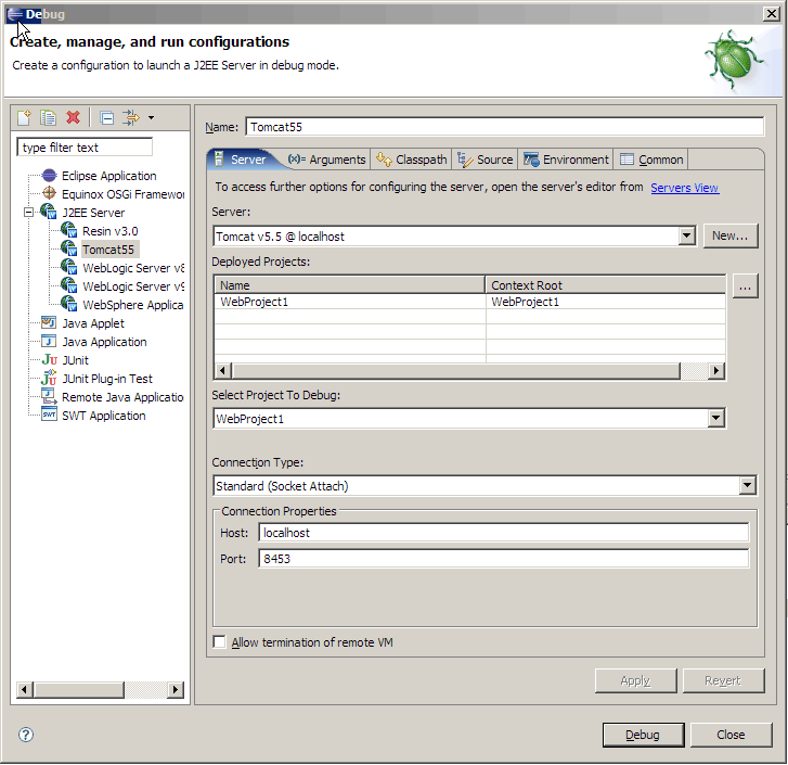 2. Click Run > Debug to modify the server definition for remote operation. Click on the name of your server under J2EE Server.