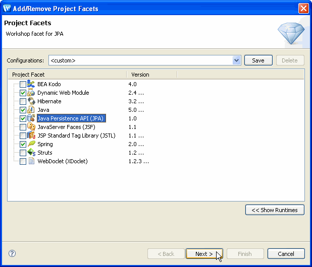This displays the Select Project Facets dialog where you can choose to add the JPA facet and optionally the Kodo or Hibernate facet.