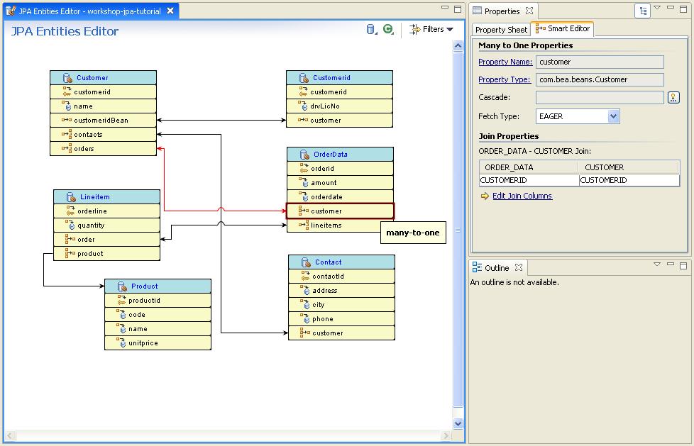 The BEA Workshop ORM Workbench allows you to view, create, and manage JPA entity relationships. The Entities Editor provides a centralized view of all entity relationships, allows for modification of entity properties, and simple navigation between the object model, mapping associations, and database schema layers.