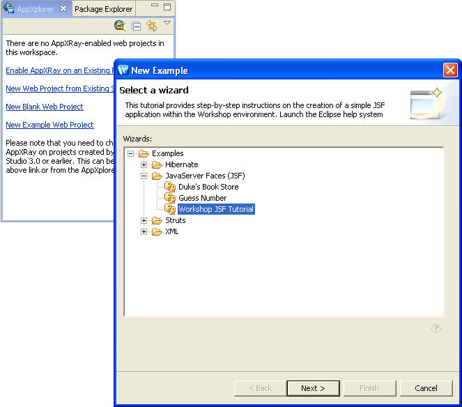 From the AppXplorer view, click on New Example Web Project . Expand JavaServer Faces (JSF) select Workshop JSF Tutorial and click Next.