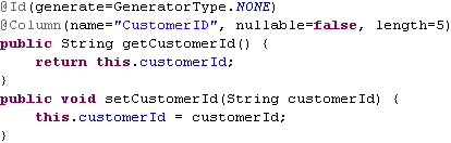 An Id property designates an identifier, such as a primary key. All entity beans must declare one or more fields which together form the persistent identity of an instance. In addition to specifying the property's name and type, the Smart Editor displays the following corresponding to attributes of the @Id annotation: