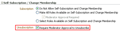 To specify that moderator approval is required before unsubscription requests are granted, select Require Moderator Approval to Unsubscribe.