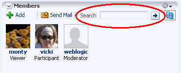 Filtering searches against a listed member's user name. For example, if your search criteria is "c", the search results might include members named "chris", "vicki", or "weblogic".