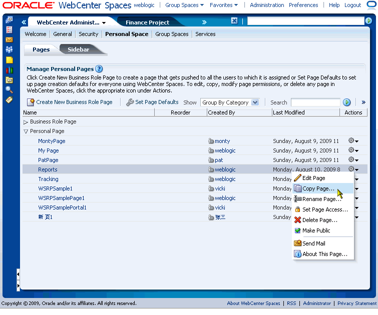 Administrators are authorized to copy any page in WebCenter Spaces. This includes other users' personal pages. When you copy a personal page as an administrator, you can save it as a business role page to be pushed to other users or as a personal page in your own personal space. If you create another business role page, you must set access on the new page because access permissions from the original page are not copied. For more information, see Section 35.1.1, "What You Should Know About Business Role Pages."