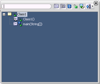 Click to display a tree of the available methods and fields of the current class and its super classes. Clicking this icon brings up the Quick Outline window (for more information, see Section 17.6, "Using the Quick Outline Window"). This window floats just above the code and contains a tree of the available methods and fields of the current class and its super classes. You can instantly start typing in a filter field to reduce the visible items, allowing quick and easy selection for navigation to the desired place |