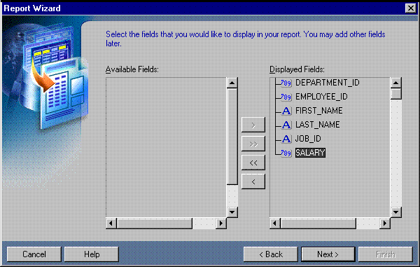 10. On the Fields page, click the double right arrows (>>) to move all of the fields to the Displayed Fields list.