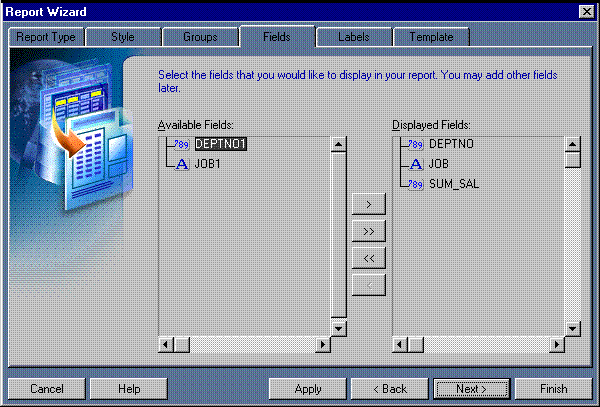 Description of "Figure 25-7 Fields page of the Report Wizard"