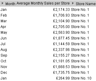 Figure 11-2 Result of query using the aggregate derived calculated item AVG(Monthly Sales Per Store)