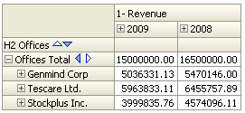 Displays results in a pivot table, which provides a summary view of data in cross-tab format and allows users to see different views of data by dragging and dropping rows and columns. Pivot tables structure data similarly to standard tables that contain column groups, but can display multiple levels of both row and column headings. Unlike regular tables, each data cell in a pivot table contains a unique value. By organizing data in this way, a pivot table is more efficient than a row-based table. Pivot tables are ideal for displaying a large quantity of data, for browsing data hierarchically, and for trend analysis. |