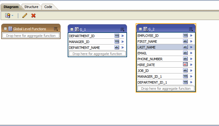 The Global Level Functions object is shown in the following figure. To add elements based on aggregate functions, drag the element to the "Drop here for aggregate function" space of the object. To add an element based on an expression or PL/SQL, choose the appropriate action from the View Actions menu.