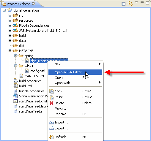 You can open the EPN Editor from a Spring context file or an Oracle CEP server configuration file in an Oracle CEP application. Alternatively, you can open the EPN Editor from a context or configuration file (see Section 6.1.1, "How to Open the EPN Editor from a Project Folder")