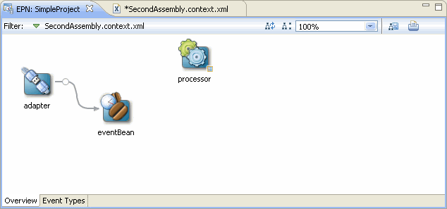 You can also filter out <bean> elements with no references in the EPN. Clicking Show/Hide Unconnected Beans will toggle the visibility of such beans as Figure 6-9 shows. For more information, see Section 6.4.3, "Laying Out Nodes".