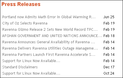 One common use of secondary pages is with dynamic lists of hyperlinked items (say, press release titles, as shown in Figure 3-17), each of which, when clicked, opens in full on a secondary page. More specifically, the target of the link opens in the replaceable region on the secondary page of the same section (by default).
