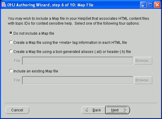| Do not include map file | Specifies that you do not want to provide a map file. This option is helpful if your help is not a context-sensitive help. |