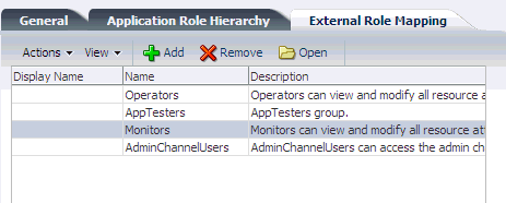 The table showing the external roles mapped to the application role is then updated to include the selected roles. In addition to adding external roles, the actions at the top of this table allow: