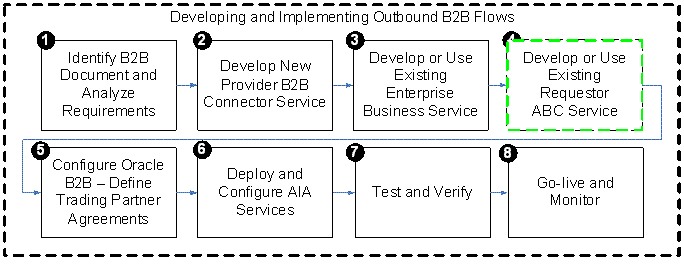 Figure 19-1 shows the high-level steps involved in developing a simple outbound business-to-business (B2B) flow from an application to trading partners using Oracle Application Integration Architecture (AIA).