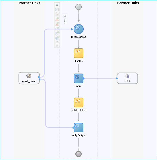 You must assemble or wire the three components that you have created: Inbound adapter service, BPEL process, Outbound adapter reference. Perform the following steps to wire components together:
