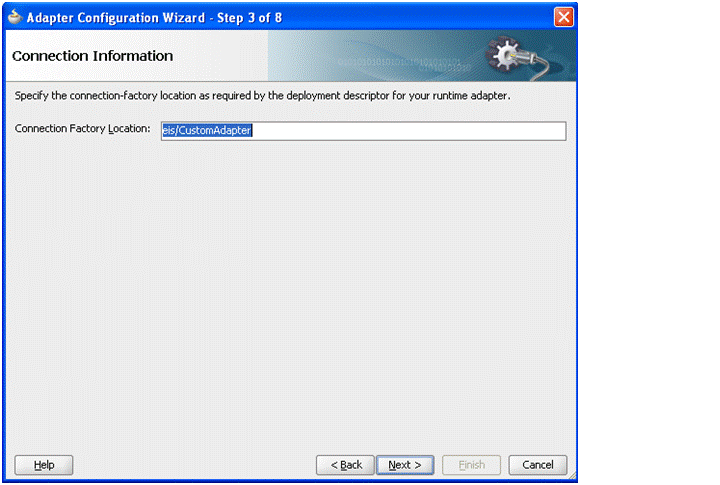 If the config.xml file contains a <connection-factory> entry (as required by the custom runtime adapter), the Wizard displays the Connection Information page displaying the default Connection Factory Location. Note that if the config.xml does not contain a <connection-factory> entry (not required by the custom runtime adapter), the Wizard does not display this page.
