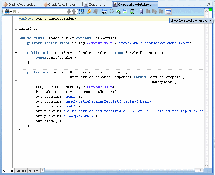 The Grades application provides a sample use of Oracle Business Rules in a Java Servlet. The servlet uses Rules SDK Decision Point API. This sample demonstrates the following: