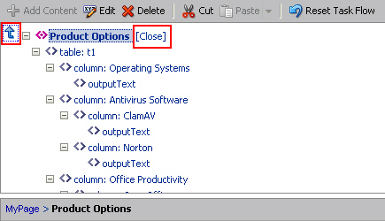Clicking the Up arrow or Close link next to an open task flow (Figure 17-54) results in the component navigator displaying the page containing the task flow.