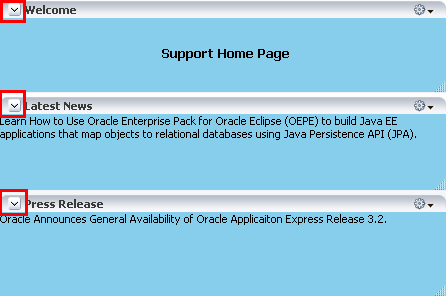 A Collapse icon on the header of a Show Detail Frame or portlet enables users to collapse such a component and display only its header. Figure 17-4 shows the Collapse icons on three Show Detail Frame components.