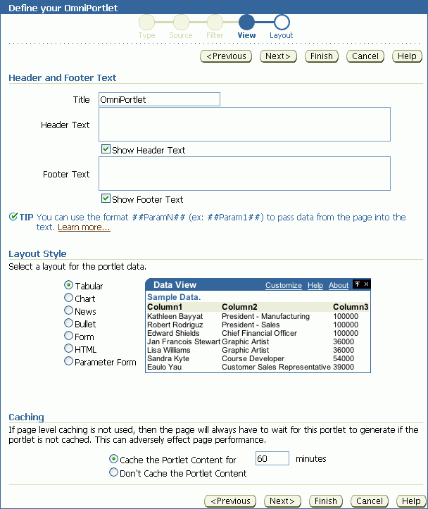 Once you have specified and filtered the data, you are ready to choose view and layout options for your OmniPortlet. The View tab (Figure 27-11) provides options for adding header and footer text, enabling caching, and choosing a layout style that you can later refine on the Layout tab.