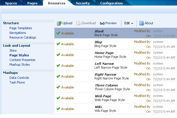 WebCenter Spaces offers a range of page styles out of the box (default page styles) and provides a means of copying page styles and editing their source (custom page styles). You can also download custom page styles, bring them into Oracle JDeveloper for additional customization, and upload them back into WebCenter Spaces. The difference between default and custom page styles is one of flexibility: many of the actions available to custom page styles are not available to default page styles.
