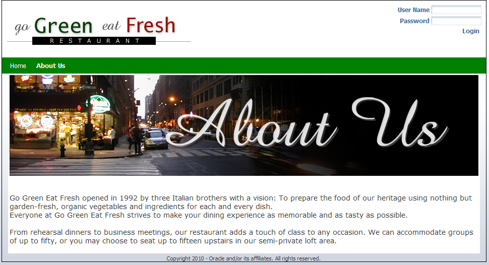 Now return to your web browser, reload the browser page and log in as the weblogic user. The About Us link appears in the navigation model next to Home, as shown in Figure 6-25.