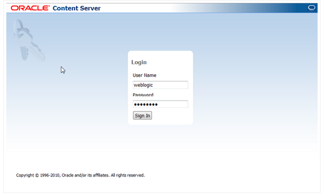 Log in to the Oracle WebLogic Server Administration Console where the UCM server is installed and enter contentadmin as the user name and the password you used when installing the product (Figure 6-13). Note the Display Name is Contentadmin.