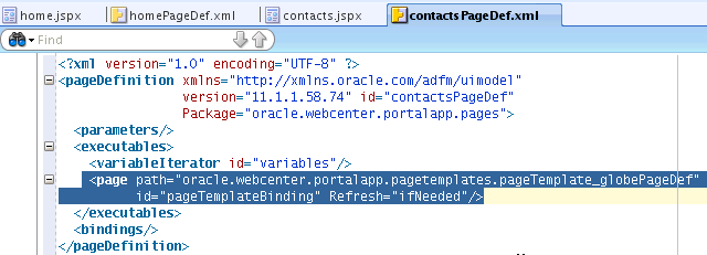 Now copy the code line highlighted in Figure 7-4, which displays the value attribute that specifies the page template bindings, and paste this code line into the contacts.jspx file where the value attribute is located, as shown in Figure 7-5.
