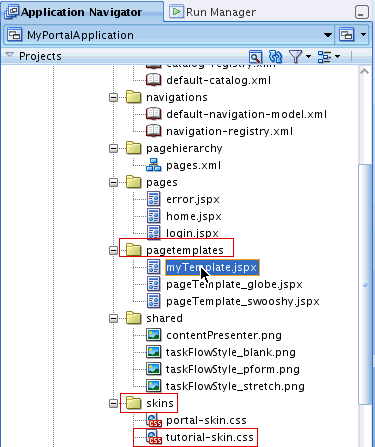 Once you refresh the page templates and skins folders in your portal application, the copied files, myTemplate.jspx and tutorial-skin.css, appear in their respective folders, as shown in Figure 4-11.