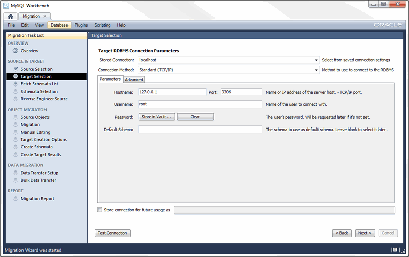 Next, set up the target (MySQL) database parameters by defining the parameters that connect to your MySQL Server instance. When finished, click to verify the connection definition. The following figure shows the Parameters tab.