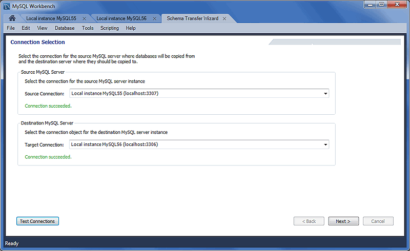 Choose your target and source MySQL connections (see the figure that follows). After choosing and testing your MySQL connections, click to continue.