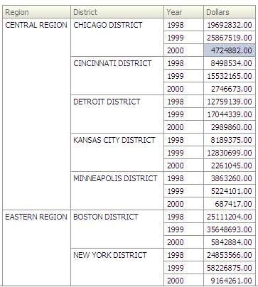 For example, in Figure 3-18, if the measure column Dollars is the master column, and you click 4724882.00 (highlighted in blue), then the master-detail event information passed is Region = CENTRAL REGION, District = CHICAGO DISTRICT, and Year = 2000.