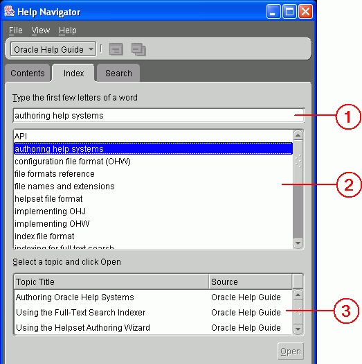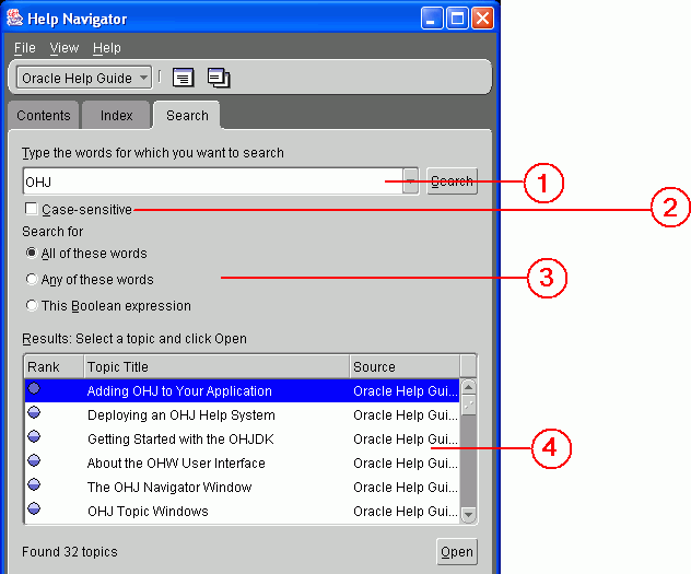 The Oracle Help for Java (OHJ) user interface has two main parts, Help Navigator window and Help Topic window. The Help Navigator window includes controls for finding topics and the Help Topic window displays HTML content.