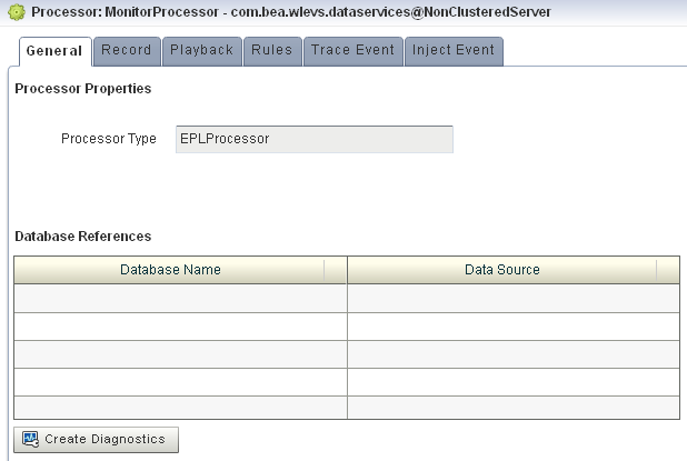 In the left pane, click Domain > Server > Applications > com.bea.wlevs.dataservices > Stages > MonitorProcessor, where Domain is the name of your domain and Server is the name of your server.