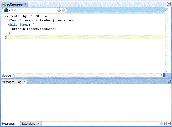 The Groovy editor provides a single environment for creating, editing, and executing Groovy scripts within the ODI Studio context. Figure C-1 gives an overview of the Groovy editor.