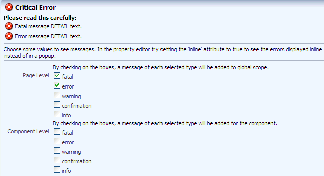 Alternatively, you can use the ADF Faces messages component if you want messages to display on the page rather than in a popup window. For more information about displaying hints and messages for components, see Section 19.3, "Displaying Hints and Error Messages for Validation and Conversion."