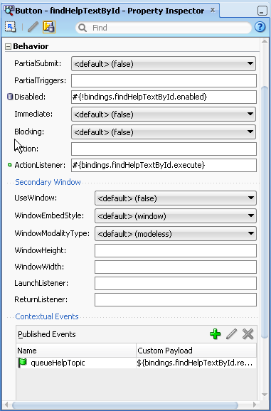You use the Contextual Events section under the Behavior section in the Property Inspector to create, publish, and subscribe to contextual events. The Contextual Events panel will only appear when you select eligible components or regions in the page, as shown in Figure 34-1.