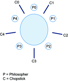 The dining philosophers scenario is a classic which is structured as follows. Five philosophers, numbered zero to four, are sitting at a round table, thinking. As time passes, different individuals become hungry and decide to eat. There is a platter of noodles on the table but each philosopher only has one chopstick to use. In order to eat, they must share chopsticks. The chopstick to the right of each philosopher (as they sit facing the table) has the same number as that philosopher.