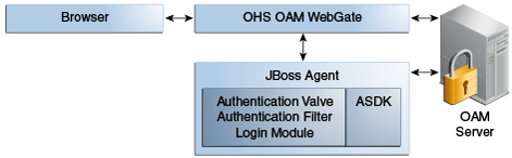 The JBoss Agent depends on the Pure Java ASDK classes and APIs for accessing and communicating with the OAM Server. The JBoss Agent implements the javax.servlet.Filter interface. For more information, see the Oracle Fusion Middleware Access SDK Java API Reference for Oracle Access Management Access Manager.