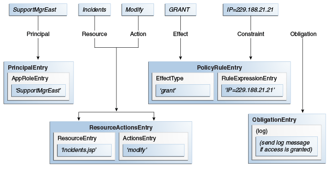 An effect (PolicyRuleEntry.EffectType) and an optional condition (RuleExpressionEntry) are defined in a policy rule (PolicyRuleEntry). The target resource (ResourceEntry) and the actions that can be performed on it are defined in a ResourceActionsEntry. The requesting user, group or role is defined as the principal (PrincipalEntry) and the principal has been assigned a role defined in an AppRoleEntry. The optional obligation (ObligationEntry) specifies information returned to the caller with the decision. It will be evaluated during enforcement of the decision (rather than during evaluation of the decision); the information may or may not be used by the caller, or affect the decision itself. These programmatic objects are stored in an instance of a policy store (PolicyStore). For more information, see Section 1.2, "Composing A Simple Policy" and Section 2.3.1, "Accessing the Policy Store." Additionally: