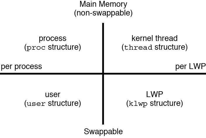 A process can consist of multiple LWPs and multiple application threads. The kernel schedules a kernel-thread structure, which is the scheduling entity in the Oracle Solaris environment. Various process structures are as follows: