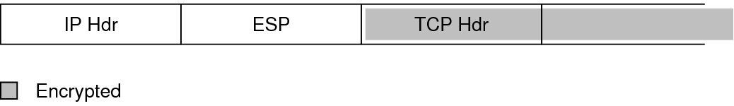 In transport mode, ESP protects the data as shown in the following figure. The shaded area shows the encrypted part of the packet.