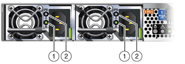 Each power supply contains two status indicators (LEDs) on the back panel. The following figure and table provide a description of the power supply status indicators.
