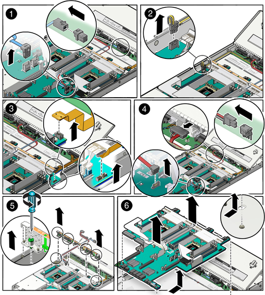 ![]() | Caution - Use the Oracle ILOM backup utility prior to removing the motherboard. This utility backs up the Oracle ILOM configuration of the service processor. For more information, see the Oracle ILOM 3.1 Documentation Library at http://www.oracle.com/goto/ILOM/docs. |