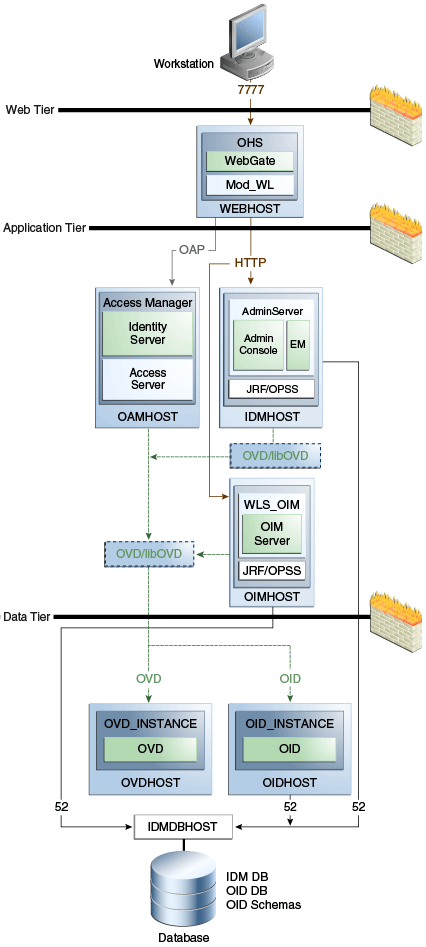 The data tier is the deployment layer where all the LDAP services reside. This tier includes products such as Oracle Internet Directory (OIDHOST), Oracle Virtual Directory (OVDHOST), and Oracle Database (IDMDBHOST).