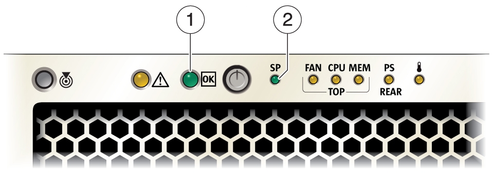 The SP OK indicator [2] flashes while the SP is starting, and the system OK indicator [1] remains off until the SP is ready.